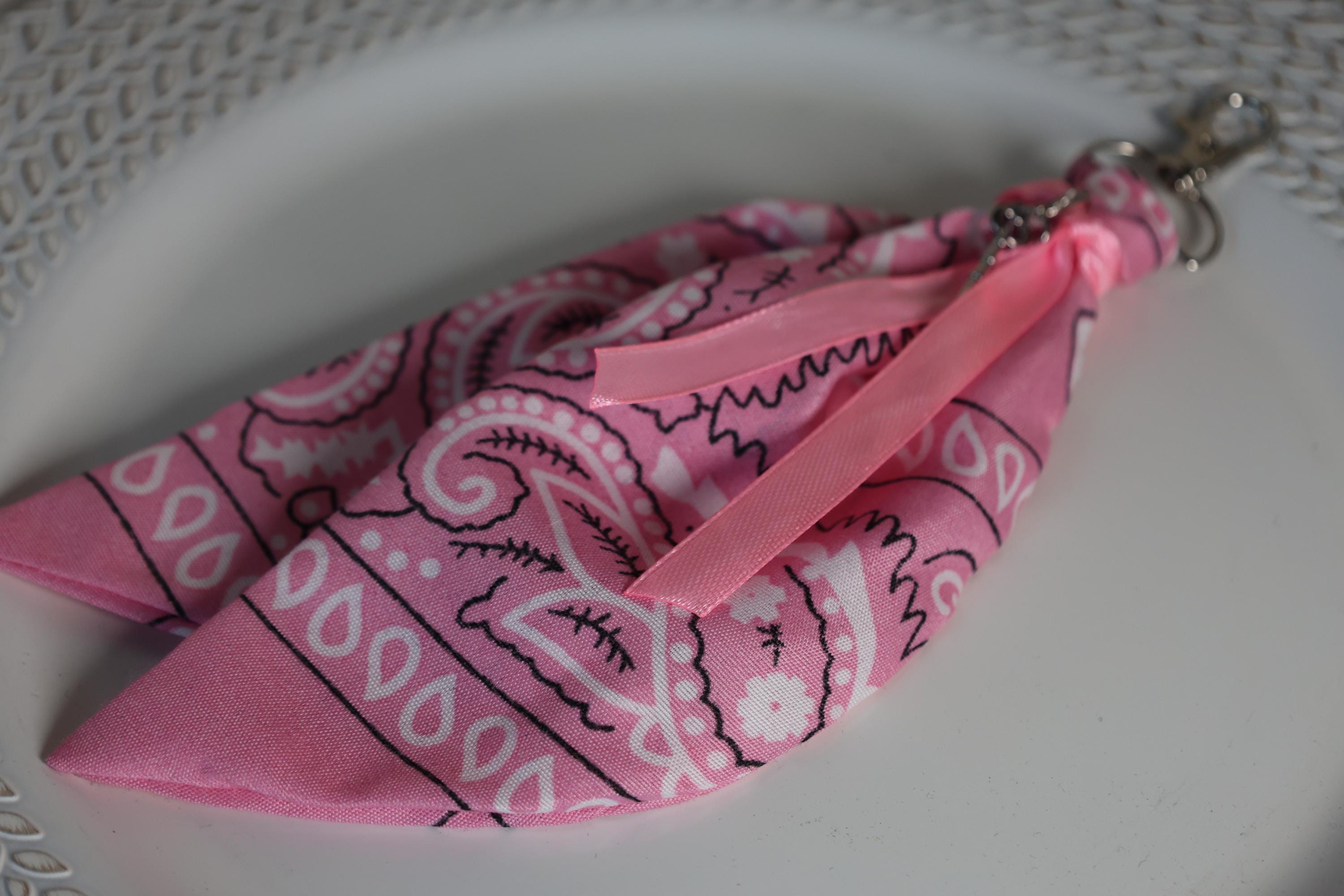 Specs Colorways: Available in Classic Red and Soft Pink. Materials: Cotton-blend bandana, satin ribbon, alloy metal hardware. Length: Approximately 9" from the top of the clasp to the hem.
