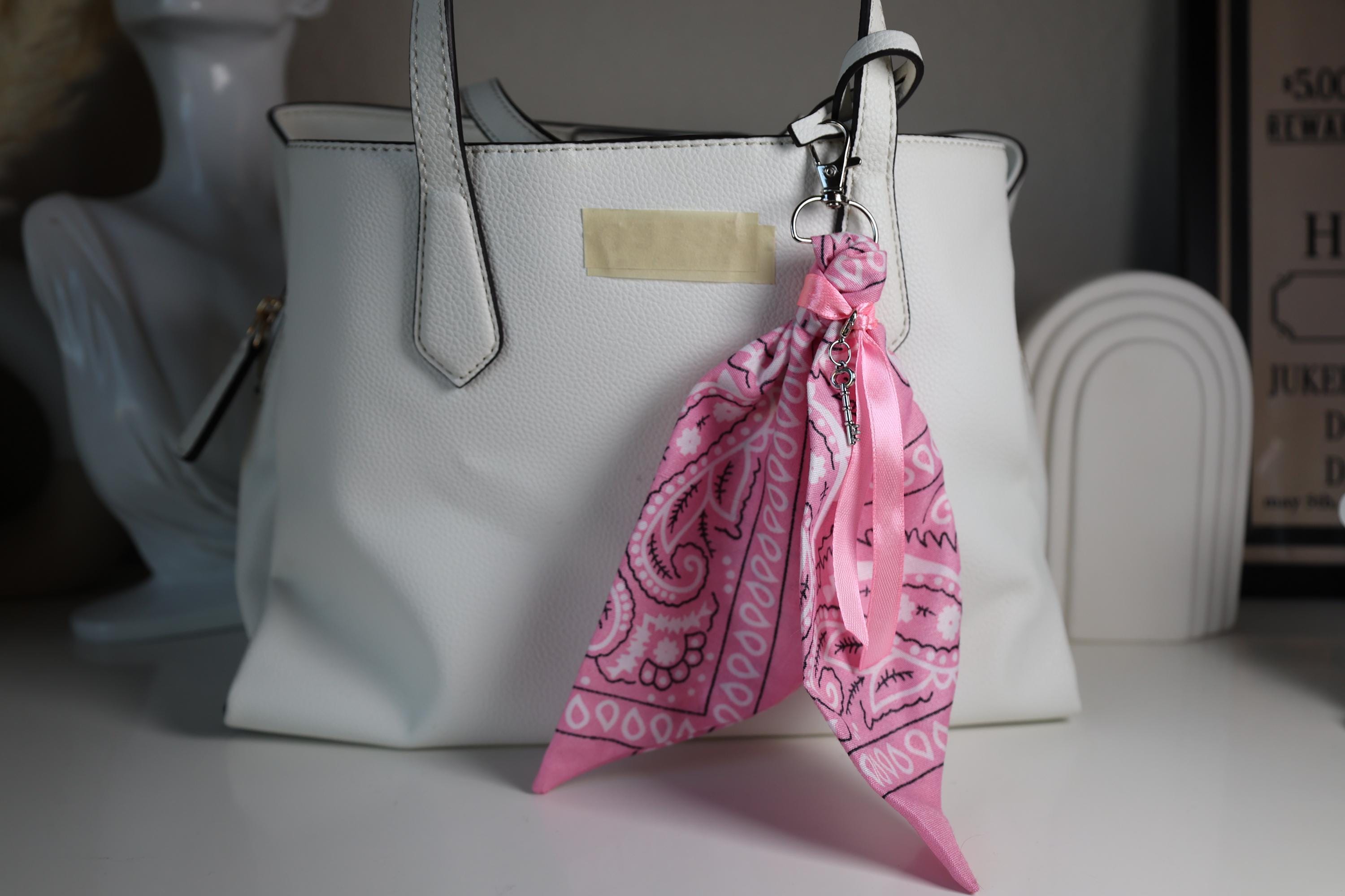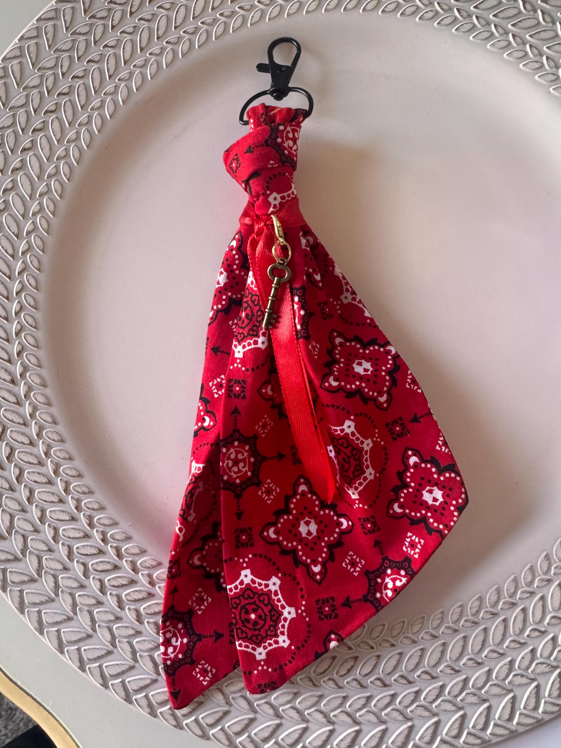 Multi-Use Hardware: Equipped with a secure lobster swivel clasp to move easily between your tote, backpack, or belt loop. The Look: Hand-knotted bandana fabric paired with a tonal ribbon and a silver-tone skeleton key pendant. Outfit Accent: Clips onto denim or trousers for a quick "Cowboy Core" or utility-chic update. Keychain Utility: Adds a soft, tactile grip to your keys, making them easy to grab from inside a deep bag.