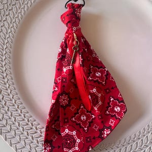 Specs Colorways: Available in Classic Red and Soft Pink. Materials: Cotton-blend bandana, satin ribbon, alloy metal hardware. Length: Approximately 9" from the top of the clasp to the hem.