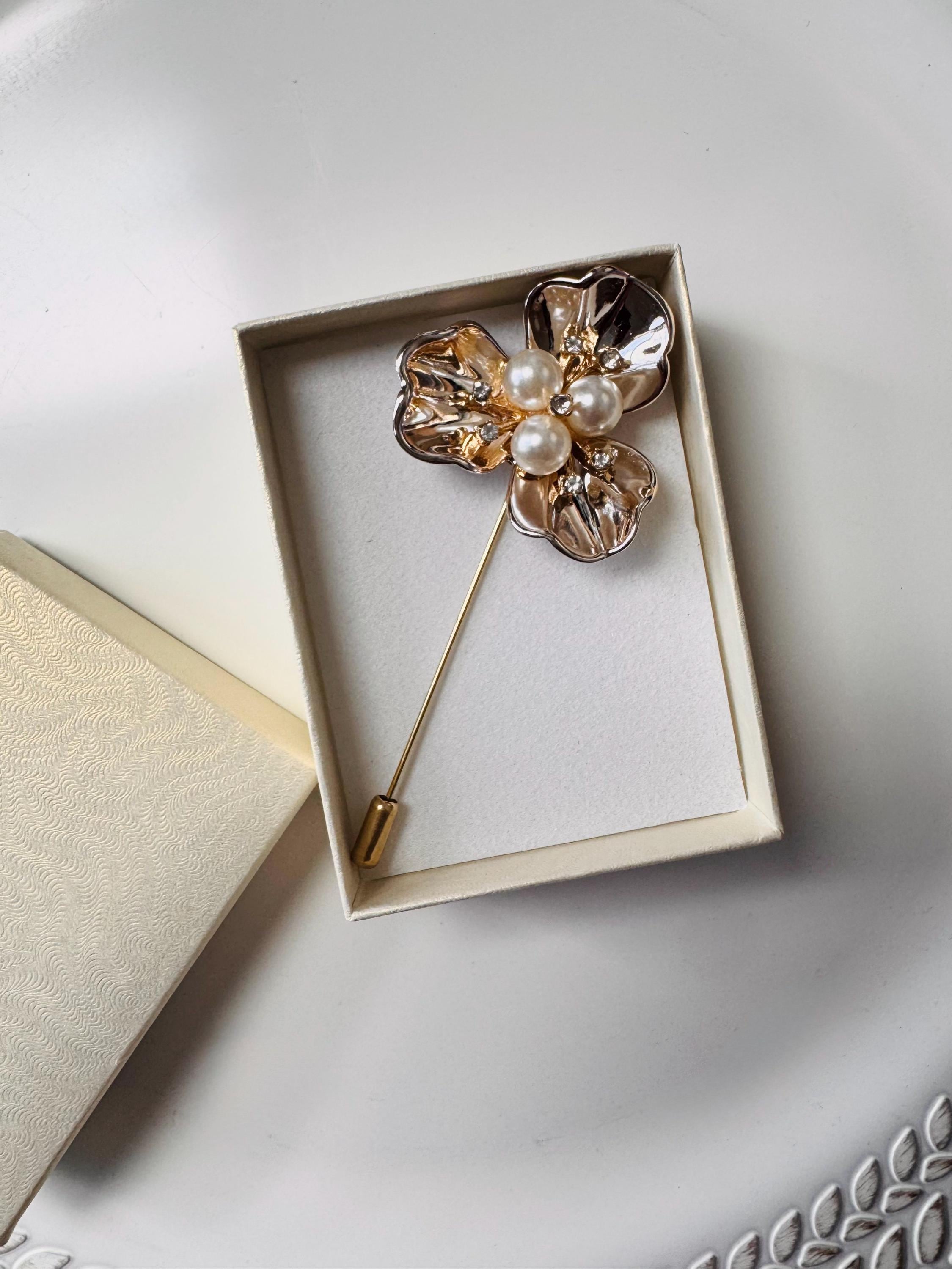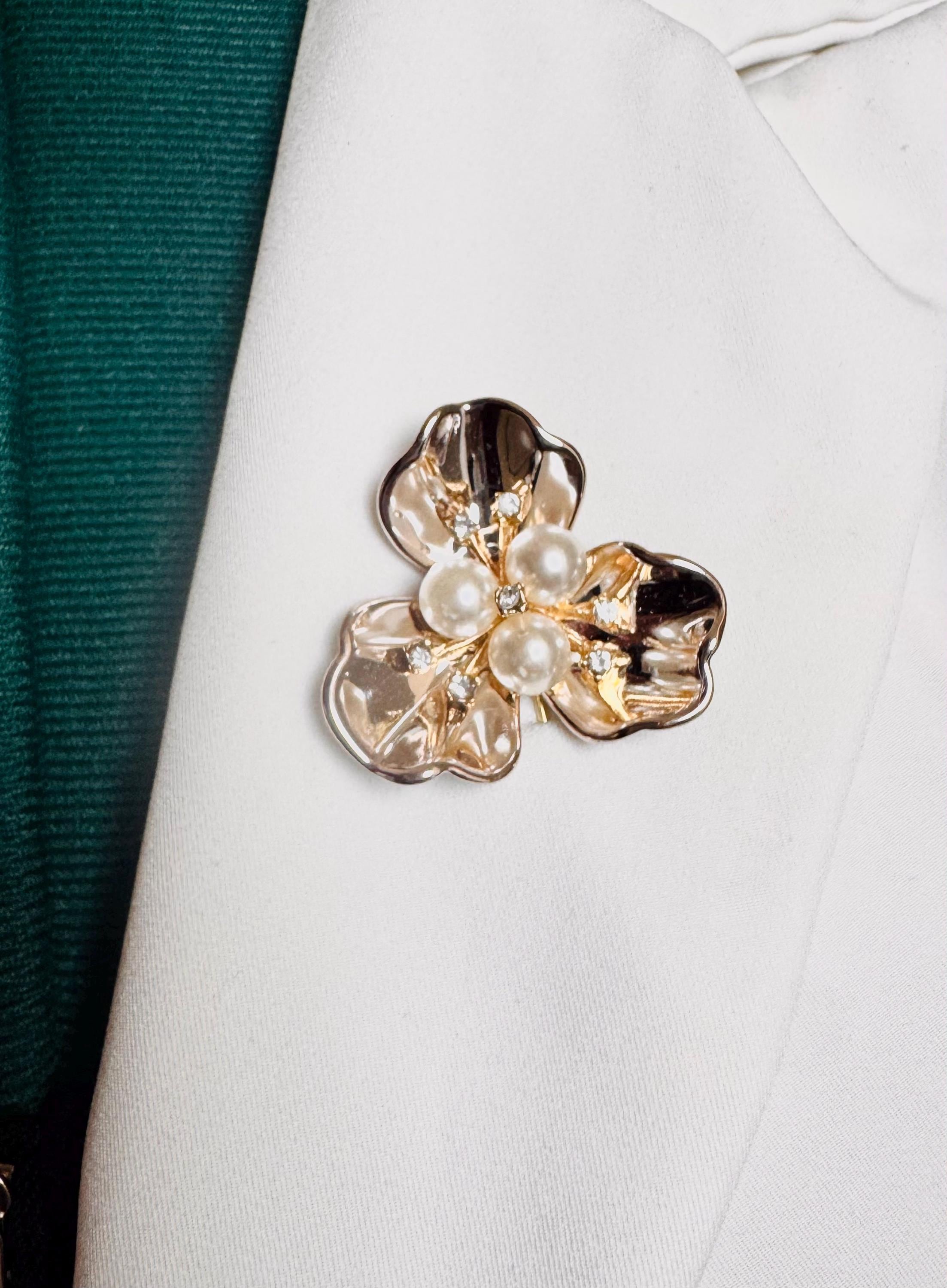 Product Features: Design: Three-petal textured flower with a high-shine gold finish. Accents: 3 central faux pearls and inset clear rhinestone crystals. Style: Stick pin / Lapel pin with a secure end-cap protector. Versatility: Perfect for bridal wear, formal events, or everyday vintage chic. Condition: Excellent